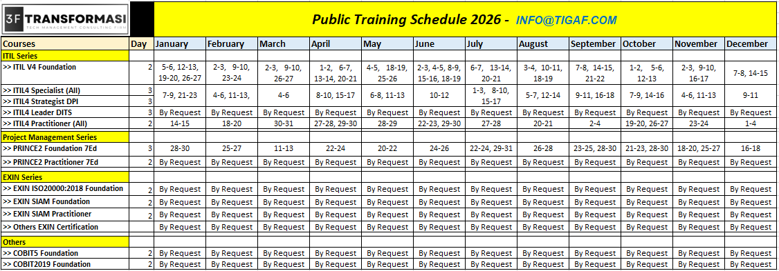 PUBLIC TRAINING SCHEDULE 2026Information: info@3FTRANSFORMASI.COM or info@TIGAF.COM or Mobile/WhatsApp: (+62) 0817 811 568